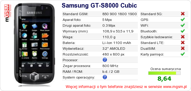 Dane telefonu Samsung GT-S8000 Cubic na Twojej stronie