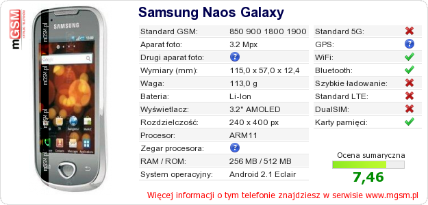 Dane telefonu Samsung Naos Galaxy na Twojej stronie