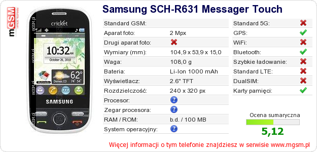 Dane telefonu Samsung SCH-R631 Messager Touch na Twojej stronie