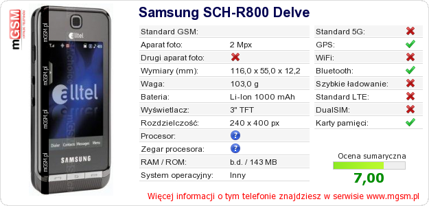 Dane telefonu Samsung SCH-R800 Delve na Twojej stronie
