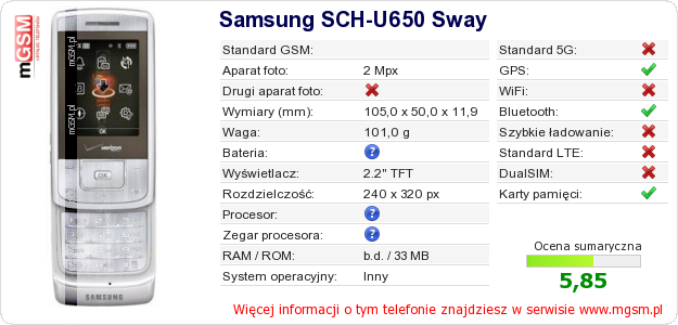 Dane telefonu Samsung SCH-U650 Sway na Twojej stronie