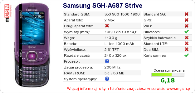 Dane telefonu Samsung SGH-A687 Strive na Twojej stronie