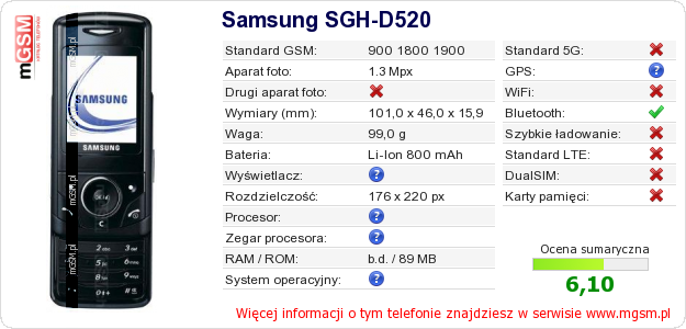 Dane telefonu Samsung SGH-D520 na Twojej stronie