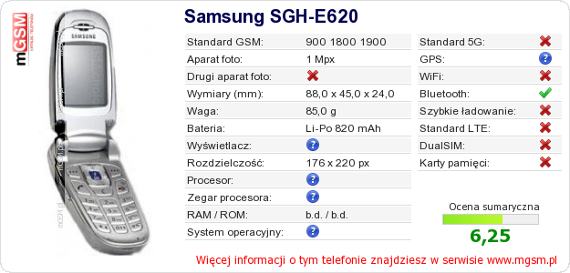 Dane telefonu Samsung SGH-E620 na Twojej stronie