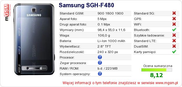 Dane telefonu Samsung SGH-F480 na Twojej stronie