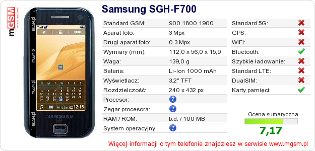 Dane telefonu Samsung SGH-F700 na Twojej stronie