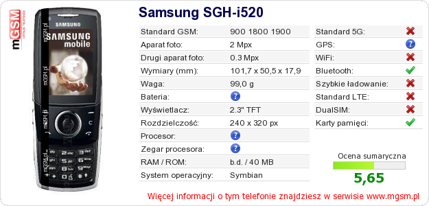 Masz swoją stronę? Chcesz wstawić gdzieś informacje o podstawowych danych telefonu Samsung SGH-i520 ? To bardzo proste. Możesz pobrać obrazek, lub skopiować i wkleić na stronę poniższy kod:Wklejenie tego kodu spowoduje wyświetlenie poniższego obrazka: