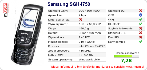 Masz swoją stronę? Chcesz wstawić gdzieś informacje o podstawowych danych telefonu Samsung SGH-i750 ? To bardzo proste. Możesz pobrać obrazek, lub skopiować i wkleić na stronę poniższy kod:Wklejenie tego kodu spowoduje wyświetlenie poniższego obrazka: