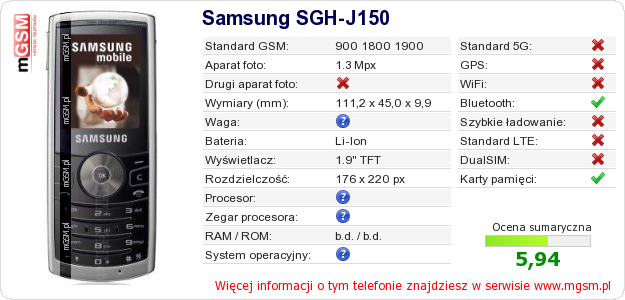 Dane telefonu Samsung SGH-J150 na Twojej stronie