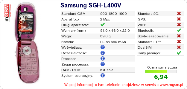 Dane telefonu Samsung SGH-L400V na Twojej stronie