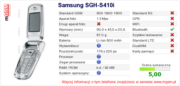 Dane telefonu Samsung SGH-S410i na Twojej stronie