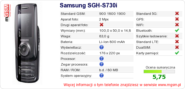 Dane telefonu Samsung SGH-S730i na Twojej stronie