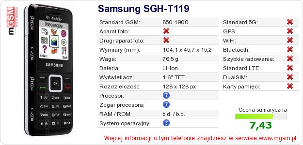 Dane telefonu Samsung SGH-T119 na Twojej stronie