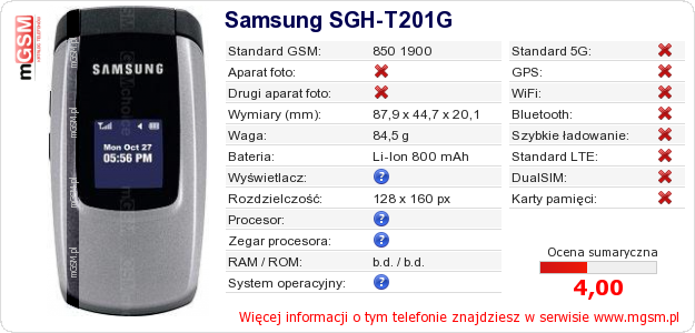Masz swoją stronę? Chcesz wstawić gdzieś informacje o podstawowych danych telefonu Samsung SGH-T201G ? To bardzo proste. Możesz pobrać obrazek, lub skopiować i wkleić na stronę poniższy kod:Wklejenie tego kodu spowoduje wyświetlenie poniższego obrazka: