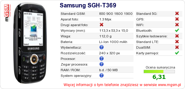 Dane telefonu Samsung SGH-T369 na Twojej stronie