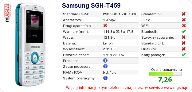 Dane telefonu Samsung SGH-T459 na Twojej stronie