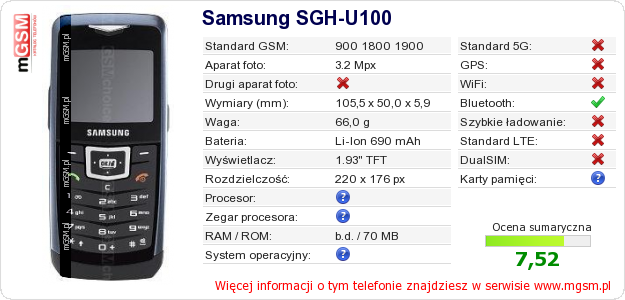Dane telefonu Samsung SGH-U100 na Twojej stronie