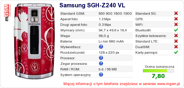 Dane telefonu Samsung SGH-Z240 VL na Twojej stronie
