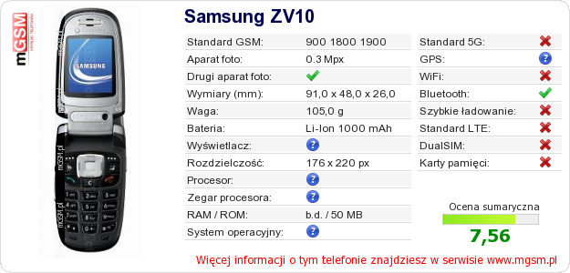 Dane telefonu Samsung ZV10 na Twojej stronie