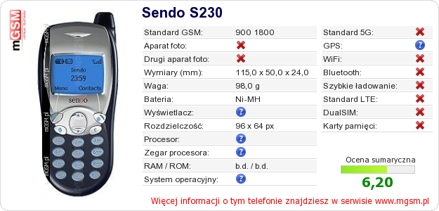 Dane telefonu Sendo S230 na Twojej stronie
