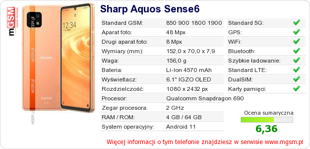Dane telefonu Sharp Aquos Sense6 na Twojej stronie