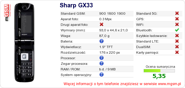 Dane telefonu Sharp GX33 na Twojej stronie