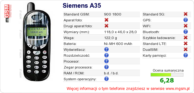 Dane telefonu Siemens A35 na Twojej stronie