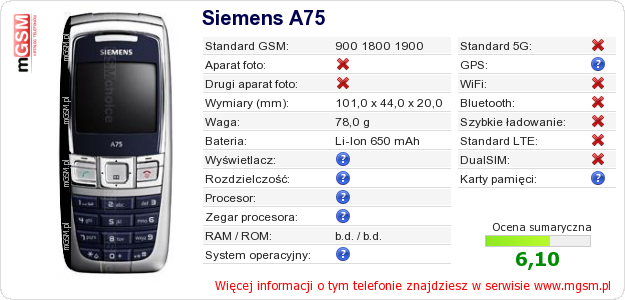 Dane telefonu Siemens A75 na Twojej stronie