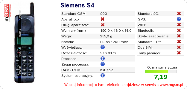Dane telefonu Siemens S4 na Twojej stronie