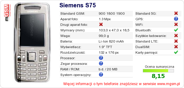 Dane telefonu Siemens S75 na Twojej stronie