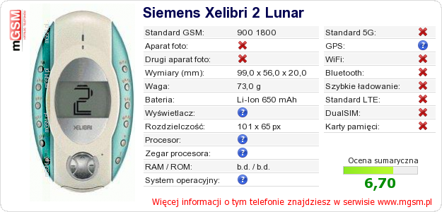 Masz swoją stronę? Chcesz wstawić gdzieś informacje o podstawowych danych telefonu Siemens Xelibri 2 Lunar ? To bardzo proste. Możesz pobrać obrazek, lub skopiować i wkleić na stronę poniższy kod:Wklejenie tego kodu spowoduje wyświetlenie poniższego obrazka: