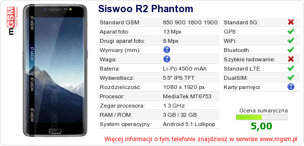 Dane telefonu Siswoo R2 Phantom na Twojej stronie