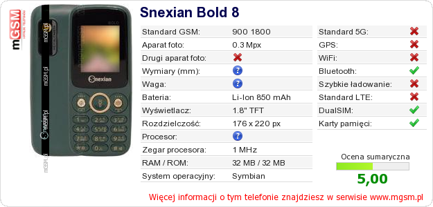 Dane telefonu Snexian Bold 8 na Twojej stronie