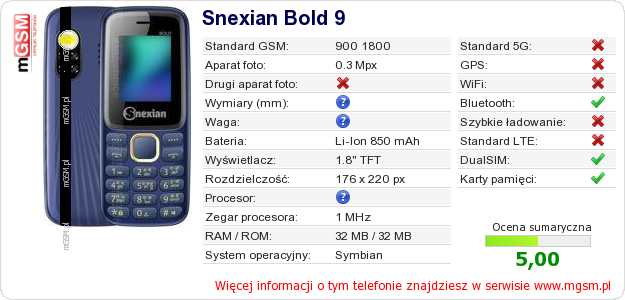 Dane telefonu Snexian Bold 9 na Twojej stronie