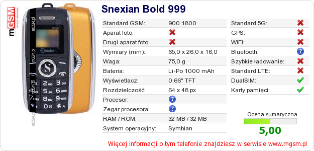 Dane telefonu Snexian Bold 999 na Twojej stronie