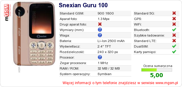 Dane telefonu Snexian Guru 100 na Twojej stronie