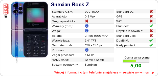 Dane telefonu Snexian Rock Z na Twojej stronie
