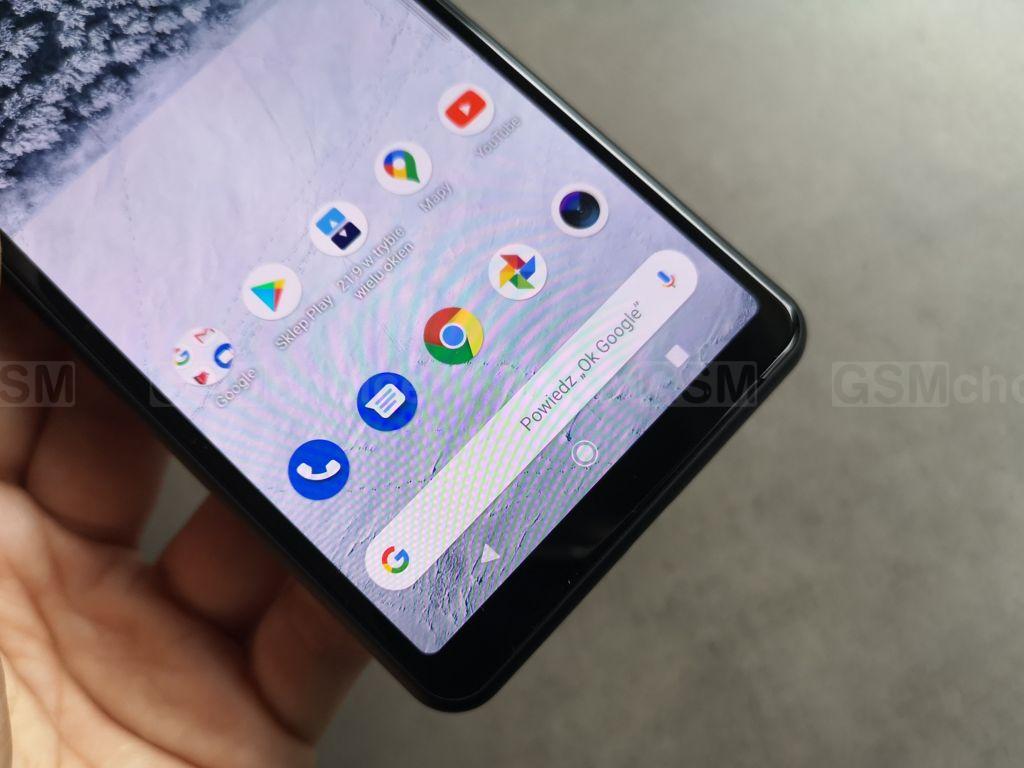Wokół ekranu zauważymy umiarkowanie szerokie, symetryczne ramki. Boczne są szczupłe, ale górnej i dolnej nie sposób pominąć. Jednak znacznie bardziej podoba mi się taki design niż gdyby producent zepsuł symetrię starając się odchudzić górną ramkę czy oszpecić ją notchem lub wcięciem. Tu jest to zrobione tradycyjnie, schludnie, bez pominięcia kluczowych elementów, które na górnej ramce zazwyczaj się znajdują. Jest więc frontowy aparat, głośnik rozmów, czujniki, nie zabrakło nawet diody powiadomień. Dolna ramka jest symetryczna, ale nie mieści żadnych dodatkowych elementów.