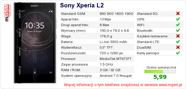 Dane telefonu Sony Xperia L2 na Twojej stronie