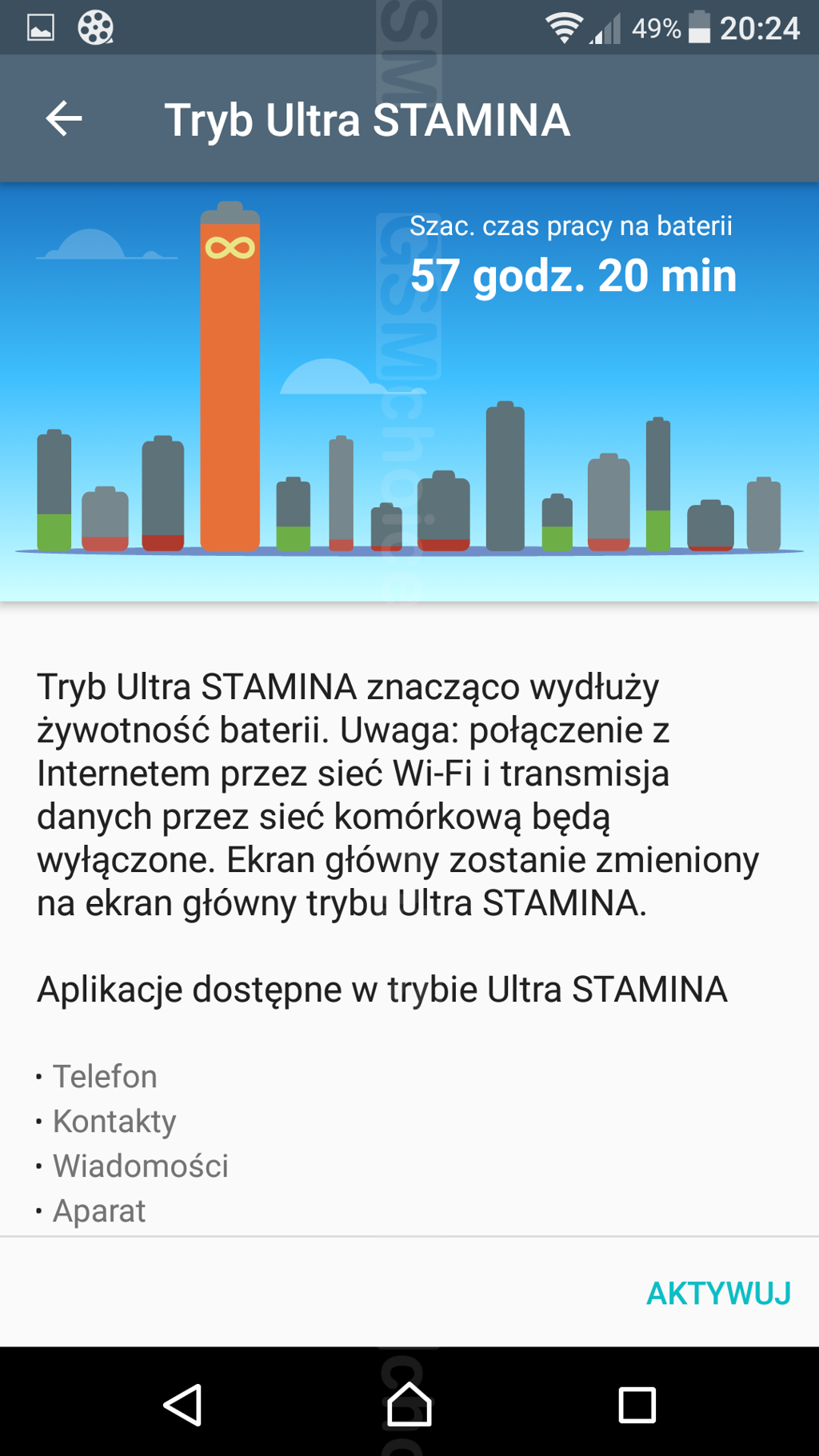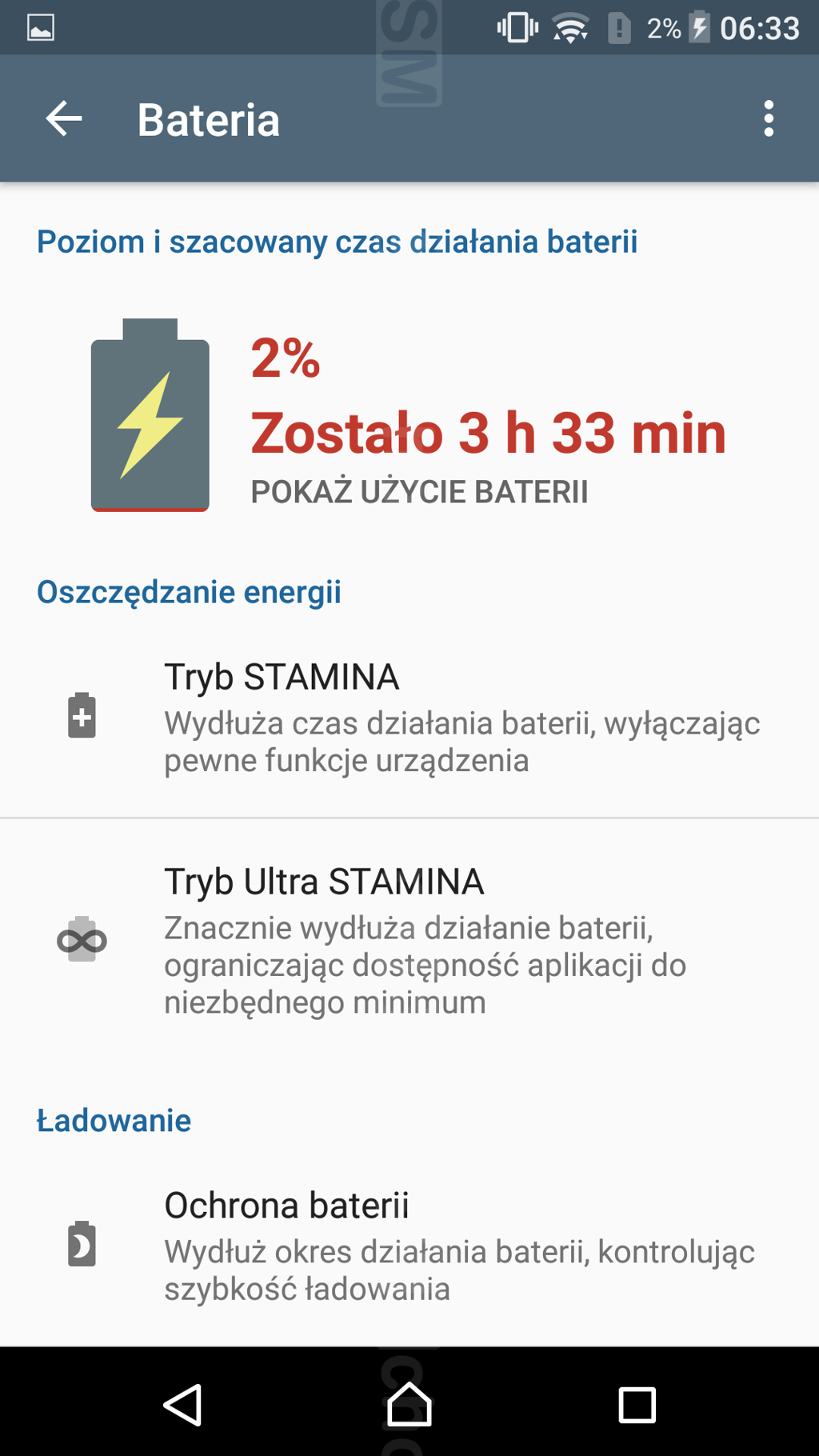 W codziennym, średnio intensywnym korzystaniu - przede wszystkim do zdjęć, mobilnego internetu, strumieniowania wideo oraz po prostu korzystania z aplikacji zainstalowanych w telefonie, telefon przetrwał 27 godzin. Gdy bardziej zmuszałam go do pracy, pod koniec dnia miałam zazwyczaj ok. 10-20% energii. Pewnie przy oszczędnym używaniu można uzyskać dwa dni pracy z dla od ładowarki. Nie zapomnijmy, ze producent zapewnia tryb Stamina i superoszczędny tryb Ultra Stamina, w którym mamy dostęp jedynie do podstawowych aplikacji do komunikacji. Czas pracy z włączonym wyświetlaczem (50% jasności, zapętlone wideo w aplikacji YouTube, włączony moduł Wi-Fi) wyniósł ponad 9,5 godziny.