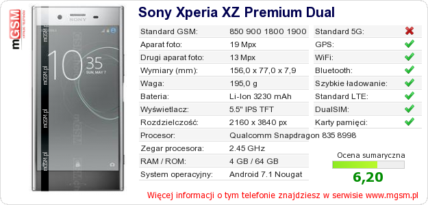 Dane telefonu Sony Xperia XZ Premium Dual na Twojej stronie