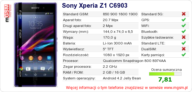 Dane telefonu Sony Xperia Z1 C6903 na Twojej stronie