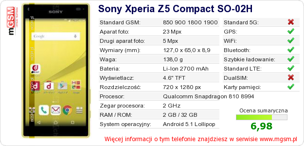 Dane telefonu Sony Xperia Z5 Compact SO-02H na Twojej stronie