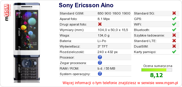 Dane telefonu Sony Ericsson Aino na Twojej stronie
