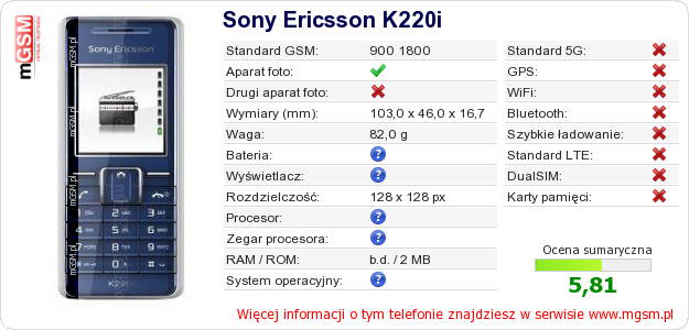 Dane telefonu Sony Ericsson K220i na Twojej stronie