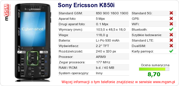 Dane telefonu Sony Ericsson K850i na Twojej stronie