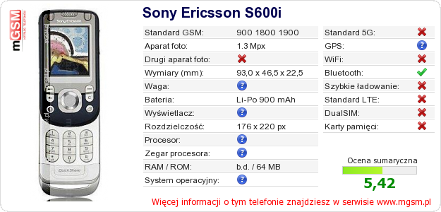 Dane telefonu Sony Ericsson S600i na Twojej stronie