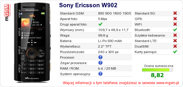 Dane telefonu Sony Ericsson W902 na Twojej stronie