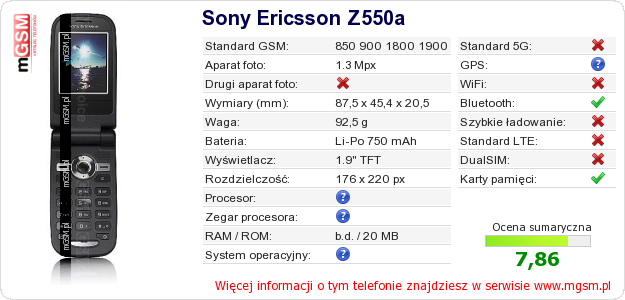 Dane telefonu Sony Ericsson Z550a na Twojej stronie