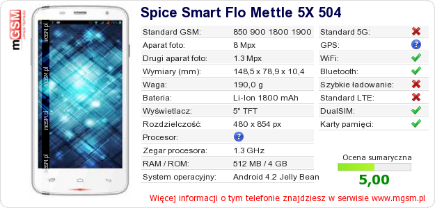 Dane telefonu Spice Smart Flo Mettle 5X 504 na Twojej stronie